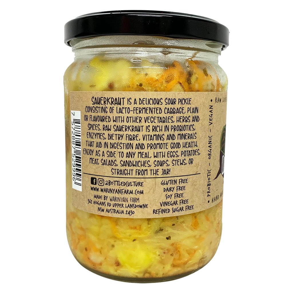 Organic Ingredients: Cabbage, carrot, onion, Himalayan salt, garlic, turmeric, mustard seed, dulse flakes.